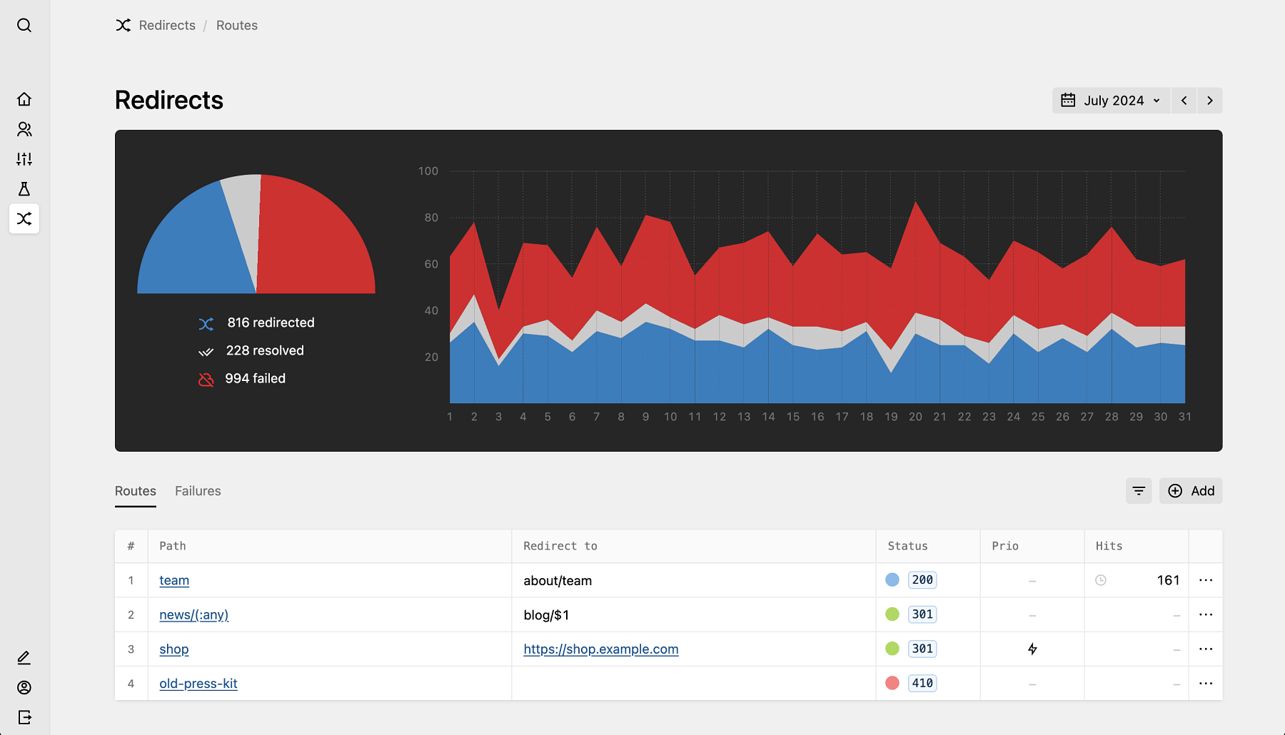 - Ensure your old URLs still find their goal: Easily define matching routes with patterns/wildcards and the HTTP status code of your choice.