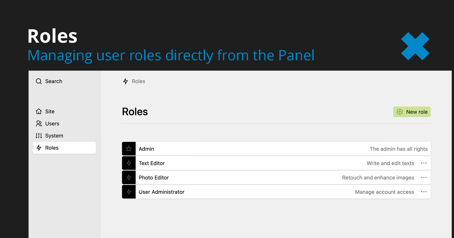 Manage Kirby user roles directly from the Panel with CRUD operations, visual permission toggles, and role assignment — no manual YAML editing required.