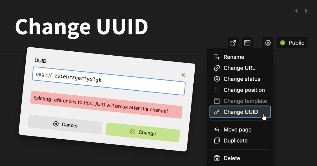 Change UUID Change UUIDs of pages, files and users directly from the Kirby Panel.