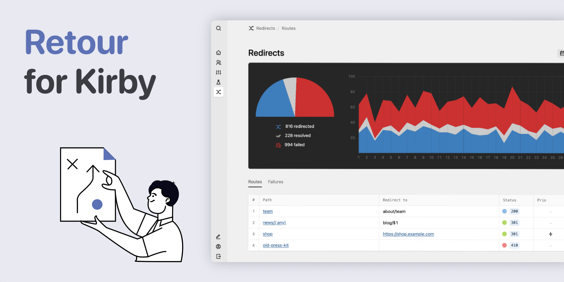 Redirects Staff picks Nico Hoffmann Retour Add and manage redirects based on rules, supporting wildcards and HTTP status codes. Track requests to your site that end up nowhere. All di… All plugins sections: redirects: extends: plugin-redirects3xx Redirects Setup HTTP status code redirects from within the Panel K5 K4